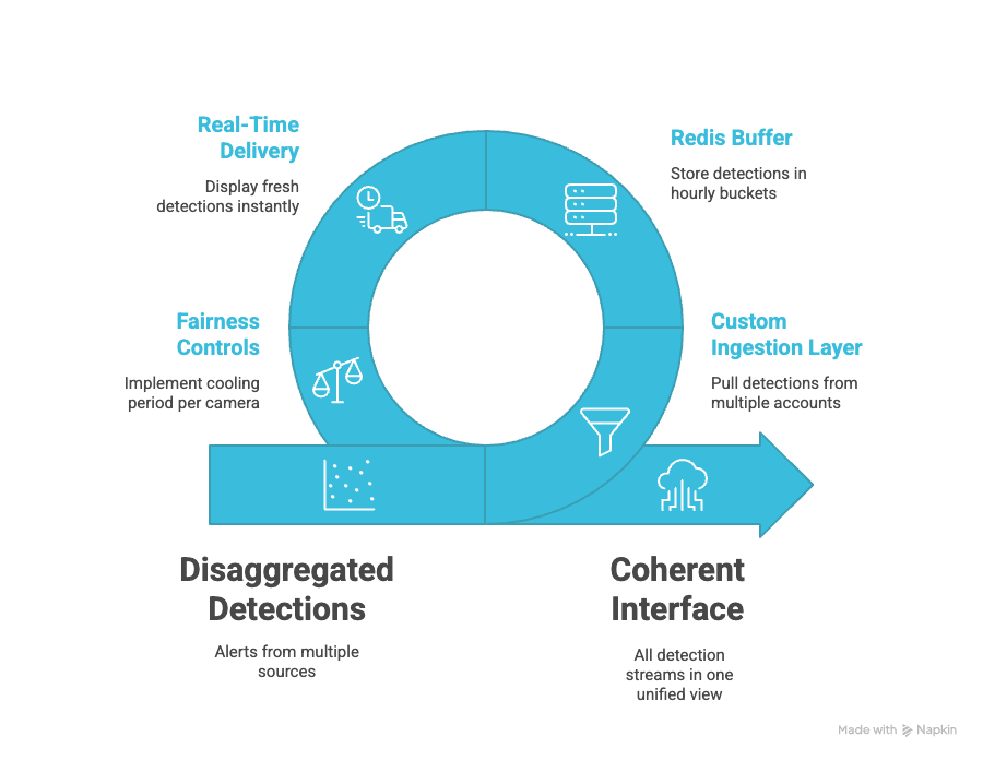 To ensure one camera doesn’t dominate the feed, we implemented a cooling period per camera. Even if a camera fires dozens of detections in seconds, only a manageable cadence flows into the Alert Center. This allows every camera — and therefore every site — to be represented fairly.